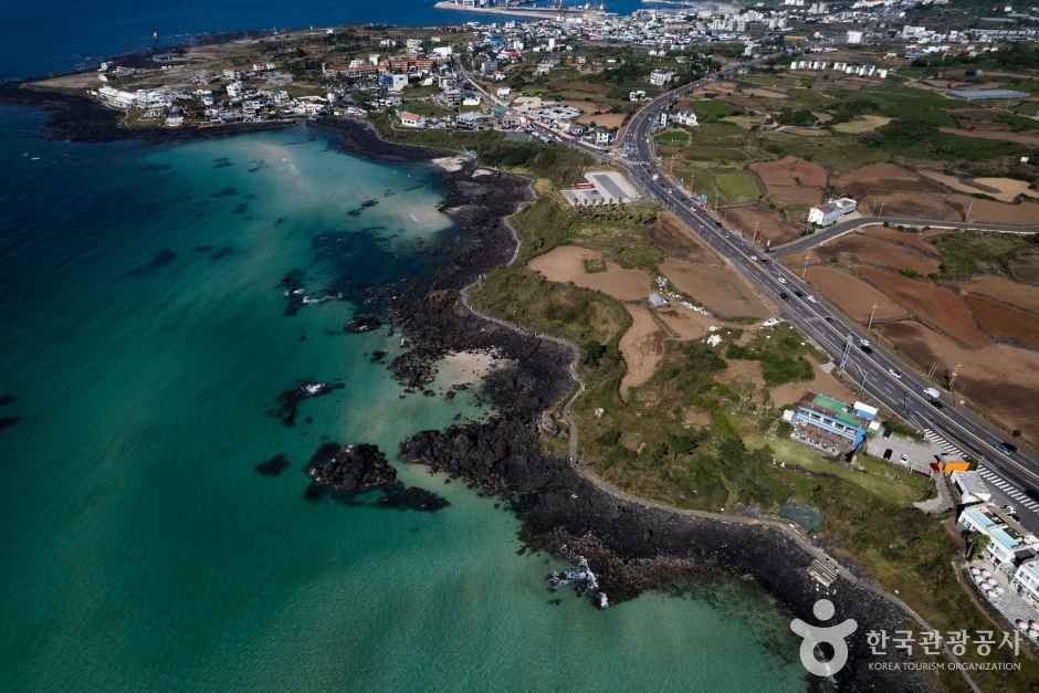 Crystal clear emerald waters and white sand beach with views of Biyangdo Island. One of Jeju's most beautiful beaches.