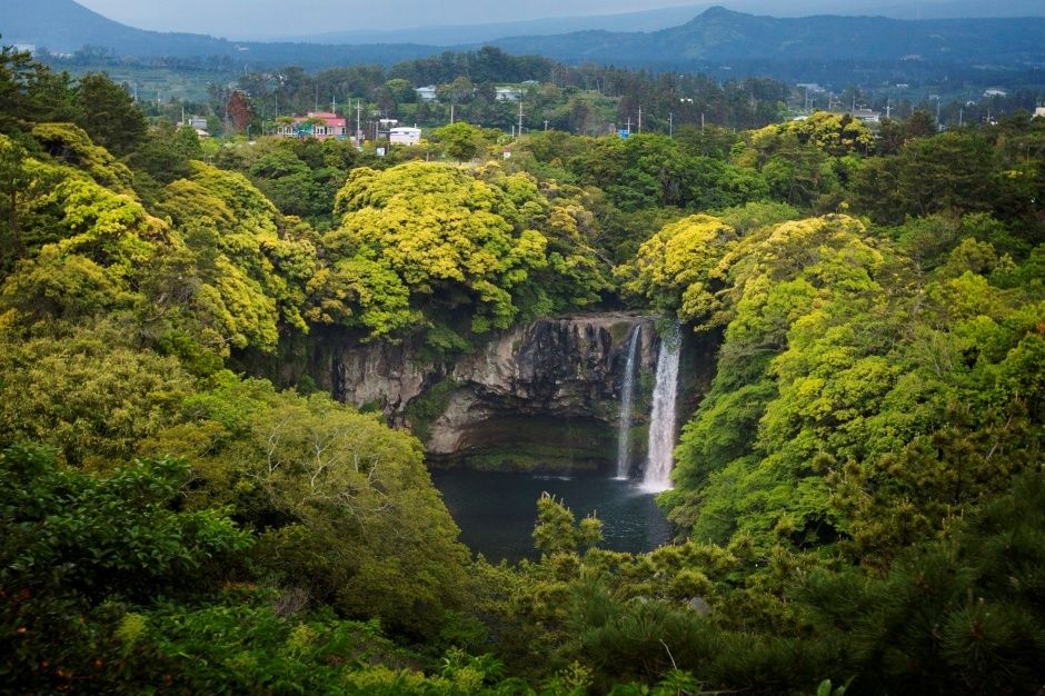 Majestic 22m waterfall meaning 'pond where sky and land meet'. Beautiful night illumination and walking trails.